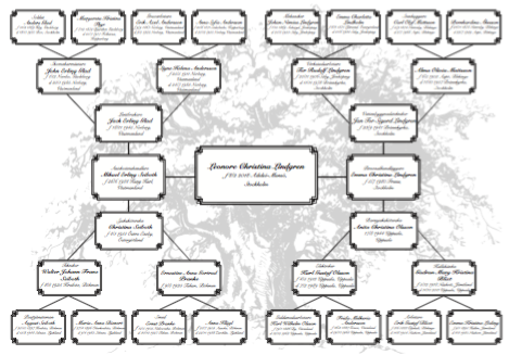 DETTA FÅR DU En antavla som presenterar information såsom yrke / titel, namn, födelsedatum, födelseförsamling, dödsdatum samt dödsförsamling.